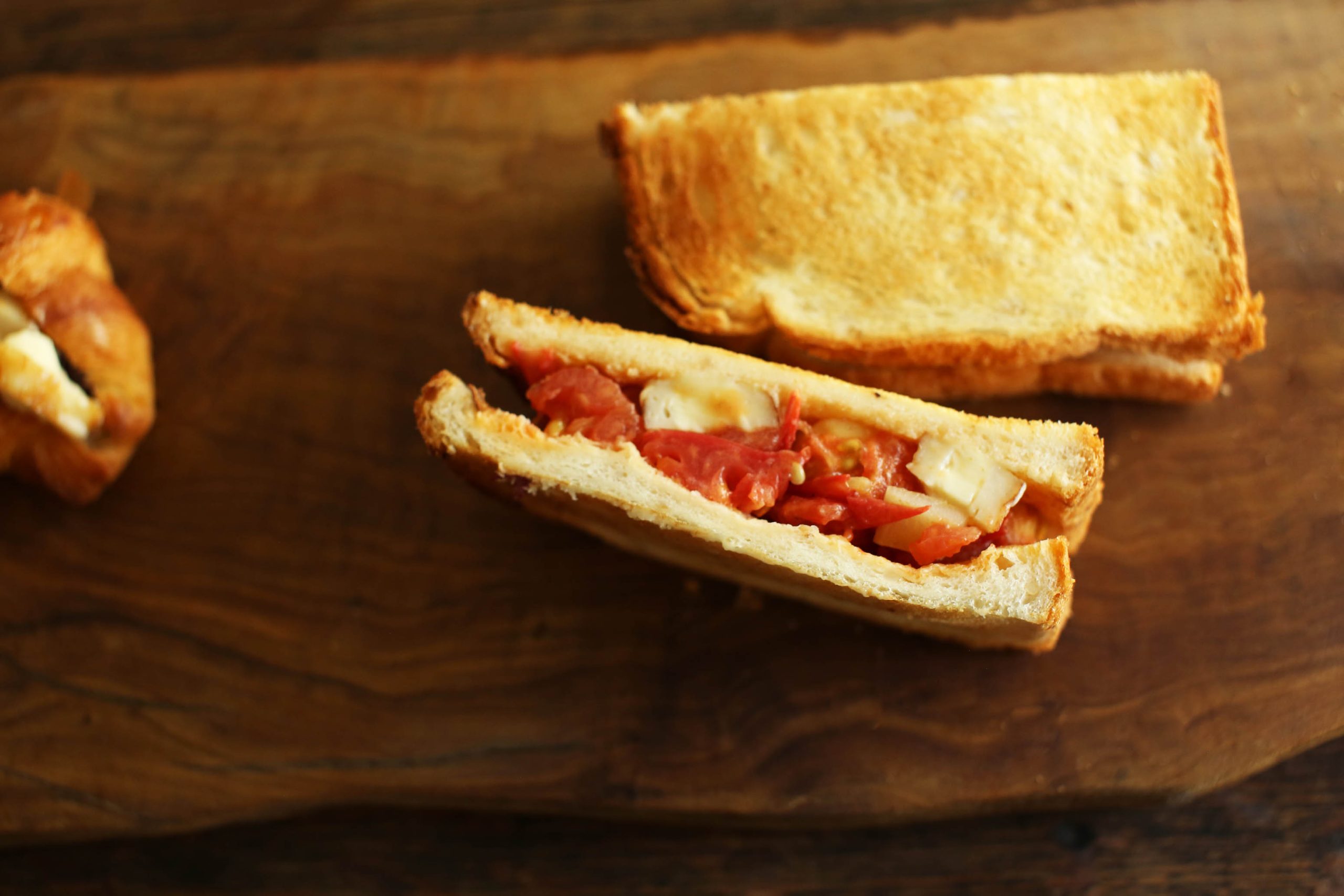 食パンの片面にチーズちくわを並べ、その間に①のトマトをのせ、もう1 枚の食パンではさむ。食べやすくカットしていただく。 !